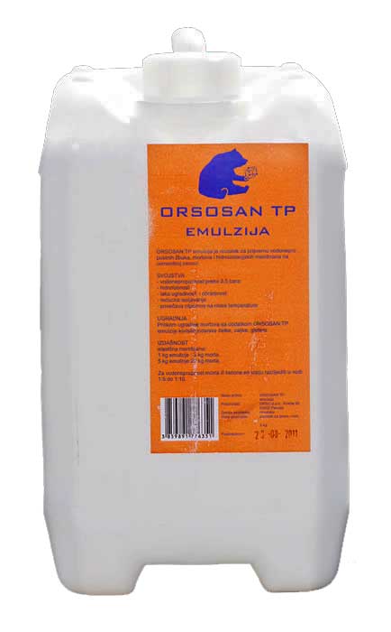 ORSOSAN TP emulzija je dodatak za pripremu vodonepropustnih žbuka, mortova, betona i hidroizolacijskih membrana na cementnoj osnovi. Područje primjene morta ili betona spravljenog sa ORSOSAN TP emulzije: mokri čvorovi u objektima, zidovi od opeke ili betonski zidovi izloženi vlaženju, vlažni podrumi, zidovi pročelja, podzemne garaže i sl.